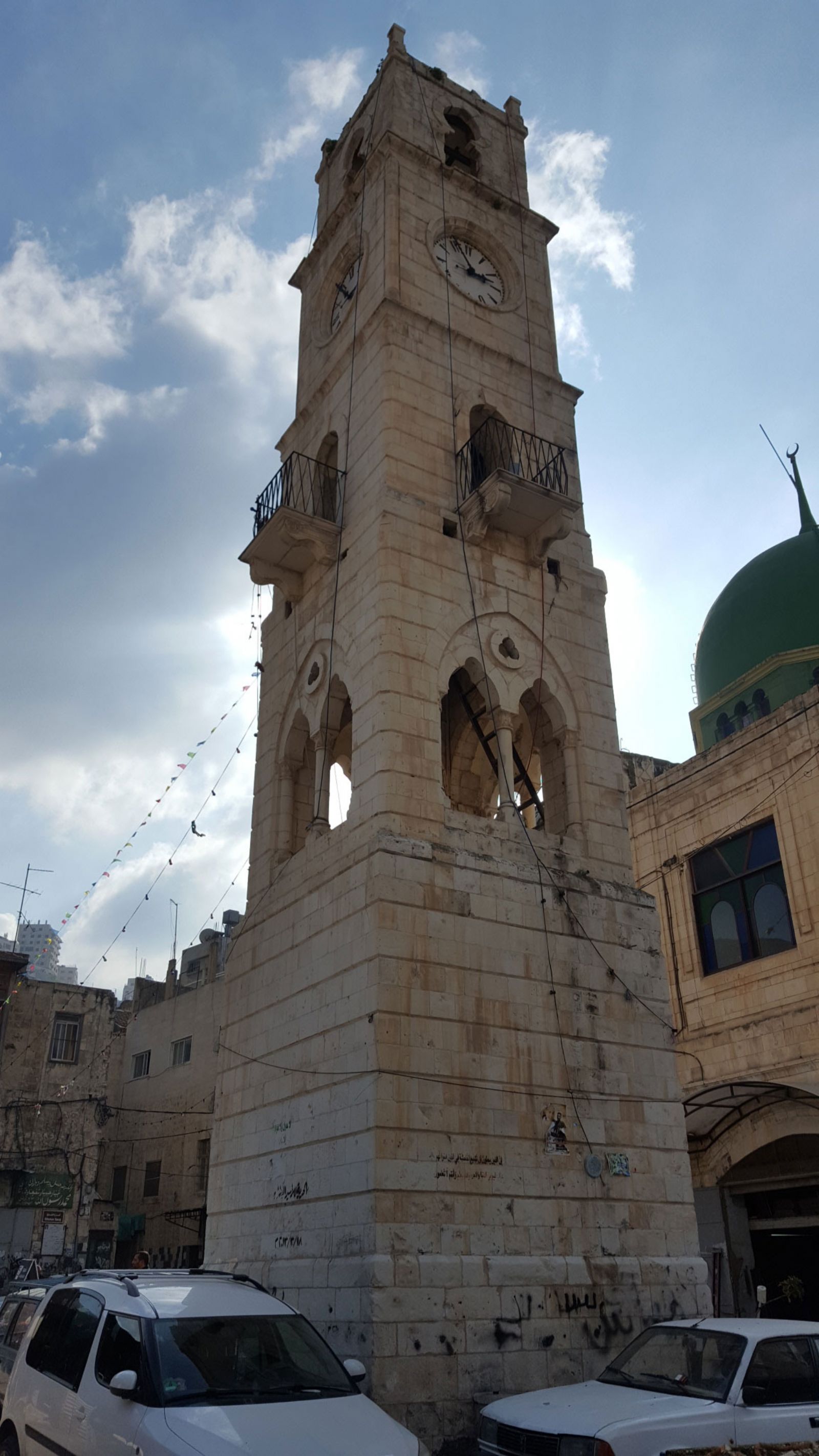 يقع في وسط الساحة القديمة و الواقعة في مركز مدينة نابلس "باب الساحة" أنشئت هذه المنارة سنة 1318هـ وذلك حسب النقش الرخامي الكتابي الواقع على مدخلها الجنوبي، و كان البرج قد أنشئ على إثر قيام السلطان عبد الحميد بإهداء مدينة نابلس ساعة بمناسبة عيد ميلاده، حيث قام الأهالي بإنشاء هذا البرج تخليداً لذكراه وابتهاجاً بعيد ميلاده. و هو عبارة عن بناء مربع الشكل عالي الارتفاع يتكون من أربعة طوابق، الأول و هو الأرضي و فيه مدخل البرج، و الثاني له شرفة حجرية و نوافذ، و الثالث حيث توجد الساعة على الجهات الأربع و الأخير علقت فيه ثقالات الساعة، و يوصل إلى أعلى المنارة من خلال سلم داخلي خشبي، و قد كان لها دور كبير في ضبط مواقيت أهل نابلس، و كان لها موظف خاص مسؤول عن صيانتها و هي الآن شعار نابلس و رمزها.